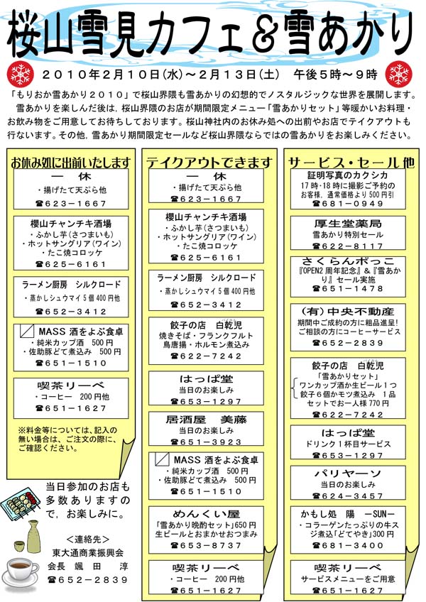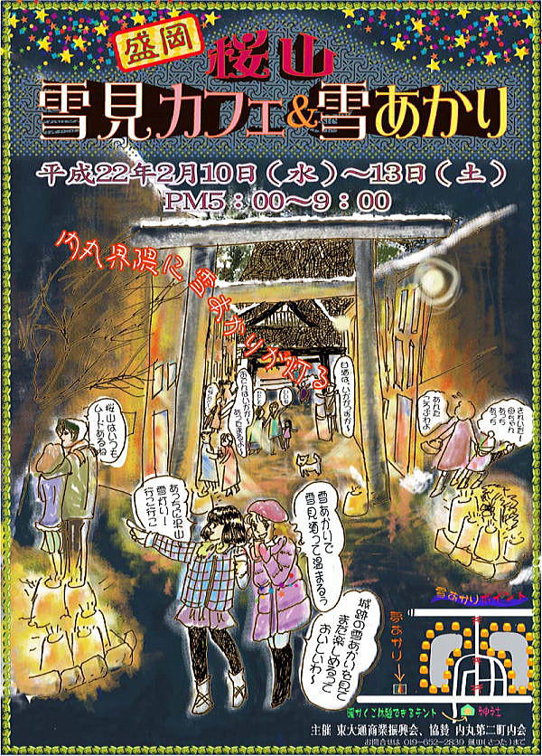 | 平成22年、東大通はもりおか雪あかりジョイント企画として雪見カフェ&雪あかり開催することになりました。期間は、雪あかりと同じ2月10日~13日、午後5時から8時までとなります。 雪あかりは、亀が池中心に300基設置される予定ですが、今回は初めてなので、町内の昭和風情と混ざり合い、どんな風合いになるのかとても楽しみです。 また、町内の飲食店などの協賛店が、これに合わせたサービスをご用意してお持ちしております。内容につきましては、下の協賛店とサービス内容を載せてございますので、どうぞご利用ください。 また、神社横の空き地には下記にありますように、商工会議所のお休み処が準備されておりますので、こちらの方もよろしくお願いいたします。 ちなみに、ポスターデザインは、盛岡市商工課の企画書の下絵をもとにノーブル佐々木がおこしました。 素人絵ですが、内丸の昭和風味が出てるかな~、とか思ってます。 |